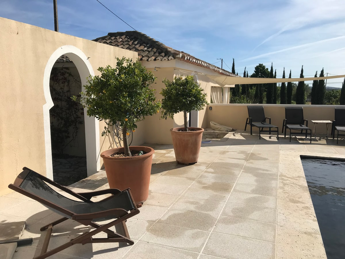 Situated on a private 2-hectare estate, the house is a true haven of peace, surrounded by preserved nature. A magnificent swimming pool overlooks the park and garden, designed in a pure Andalusian style. The paths punctuated with fountains, water channels, and cascades bring freshness and serenity, amidst orange trees and olive trees.